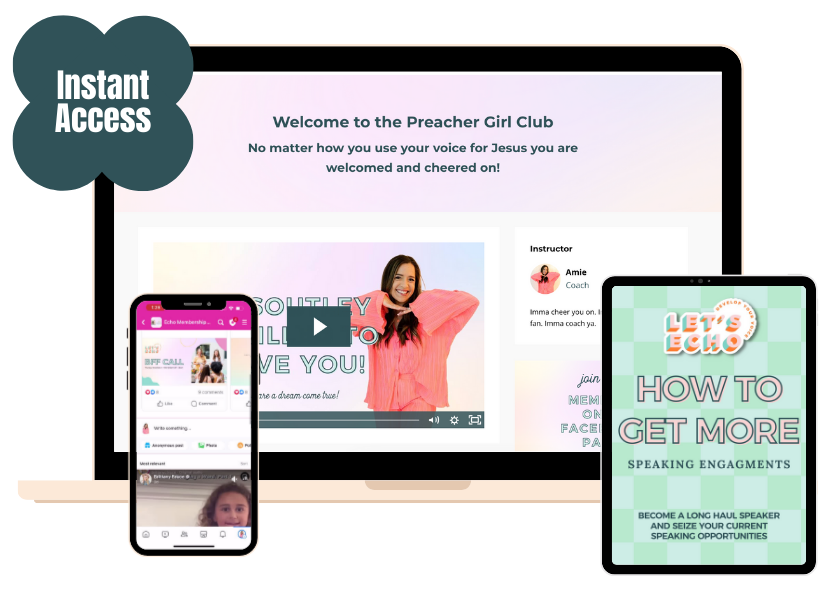 Be a part of a thriving community of like-hearted women, just like you, who are on a mission to preach Jesus loud and clear. Learn and grow together as you give one another feedback, cheer each other on, and build community.